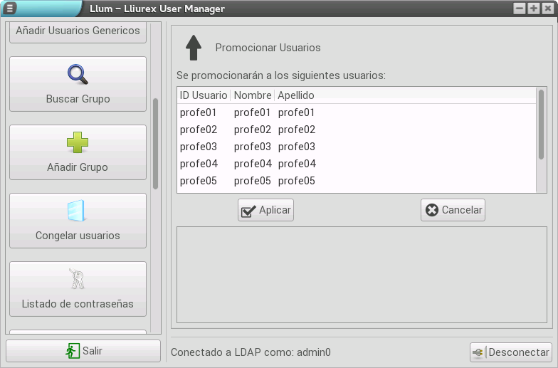 Para aplicar la promoción de usuarios, pulsamos el botón Aplicar y se realiza la modificación.