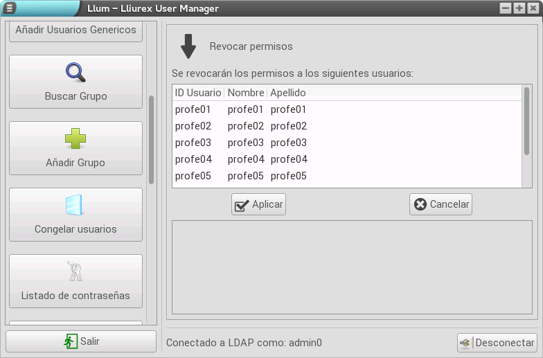 Para realizar la acción contraria a la anterior, es decir, eliminar los permisos otorgados a los usuarios de un determinado grupo debemos pulsar el botón Revocar permisos a usuarios de grupo/s. Una vez pulsado, se muestra un listado todos los usuarios del grupo, los cuales serán degradados.