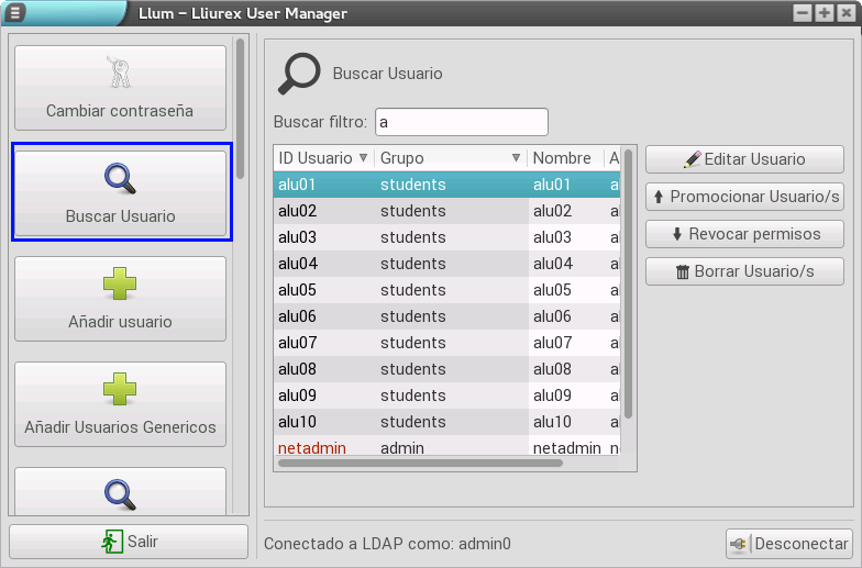 Si necesitamos realizar operaciones sobre los usuarios, el LLUM nos proporciona varias opciones: