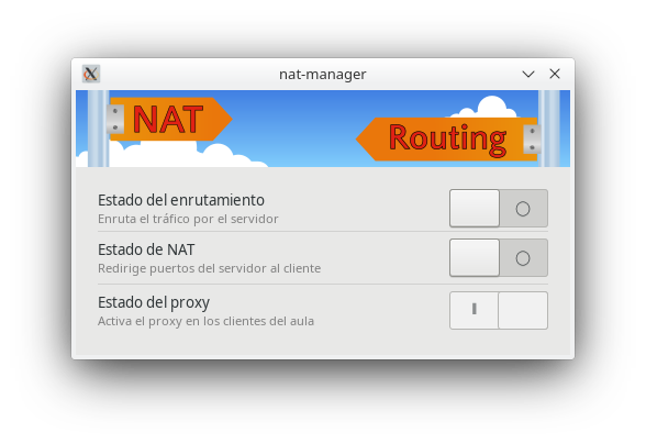 En ocasiones, se puede dar el caso de que queramos que los clientes que no tengan configurado el proxy, puedan tener conexión a Internet (ésto suele pasar con aulas que tienen equipos Windows o LliureX con versión escritorio). También puede ocurrir que queramos que los clientes tengan acceso a una impresora que está en otra subred. Para poder solucionar estas situaciones, LliureX nos ofrece la aplicación Gestor de enrutamiento y NAT la cual sólo está disponible en los servidores.