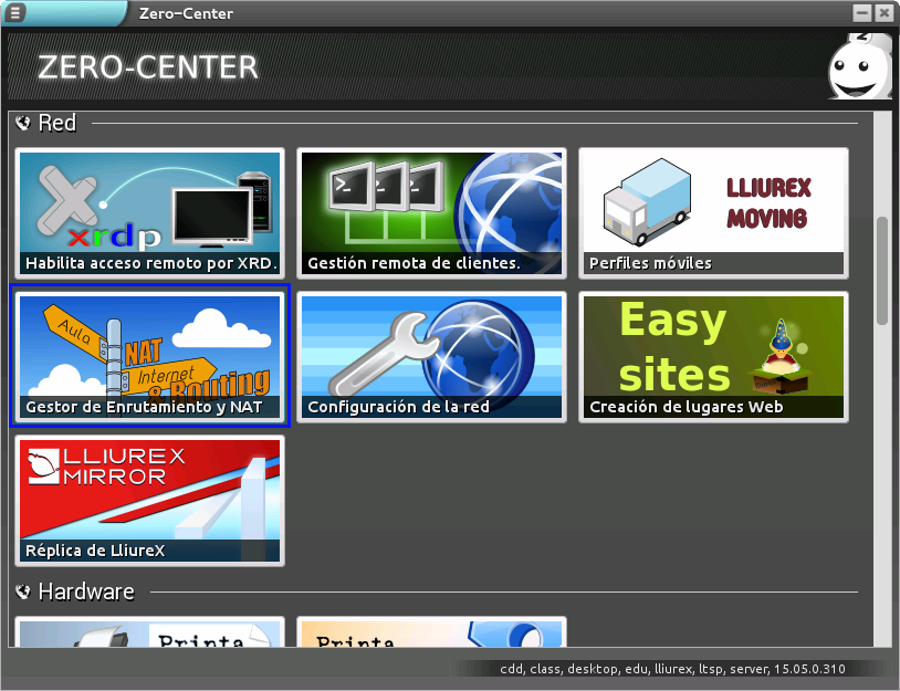 Esta aplicación viene instalada por defecto en todos los servidores, por lo que podemos acceder a través del Centro de control de Lliurex, ubicado en el menú: Aplicaciones -> Administración LliureX -> Zero Center, centro de control de LliureX.