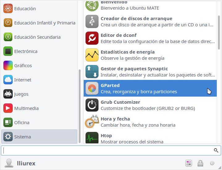 Para iniciar gparted vamos a Inicio > Sistema > Gparted.