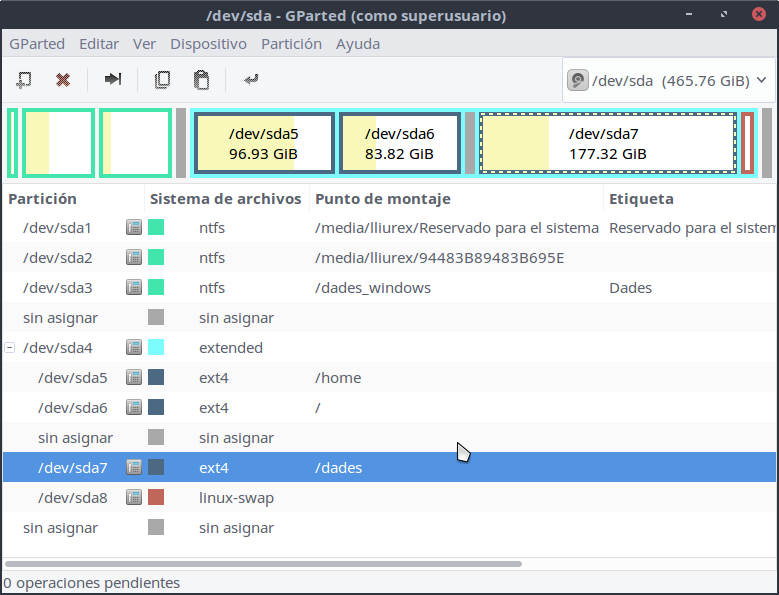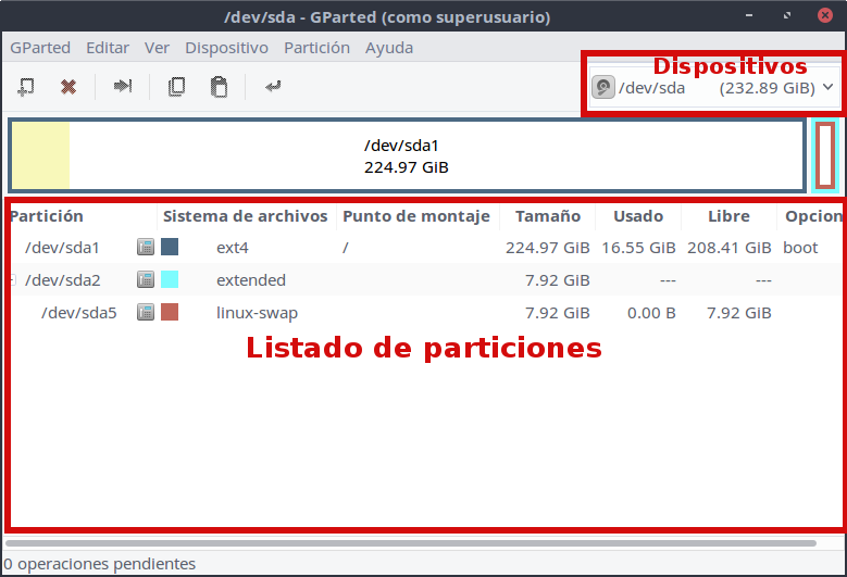 Nos pedirá que nos autentiquemos como administradores y podremos ver el entrono gráfico. Se puede ver la tabla de particiones de cada uno de los dispositivos que tenemos conectados a nuestro ordenador. Este seria un ejemplo de tabla de particiones estándar donde podemos ver la partición principal y la partición de intercambio.