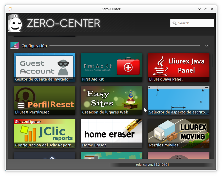 La instalación del Hot potatoes se realiza desde el Zero Center, Inicio > Administración LliureX > Zero Center, centro de administración de LliureX: