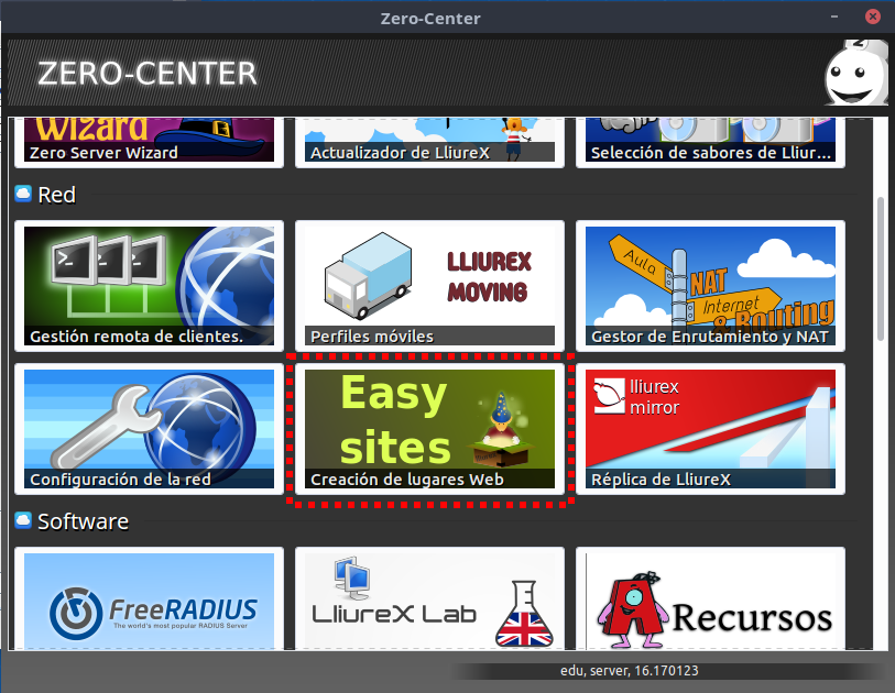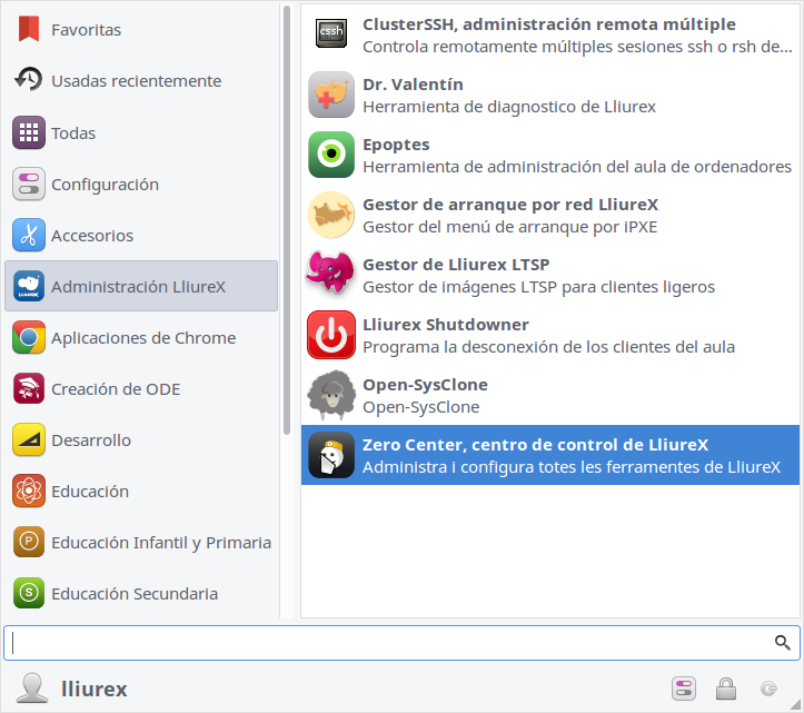La instalación del Hot potatoes se realiza desde el Zero Center, Inicio > Administración LliureX > Zero Center, centro de administración de LliureX: