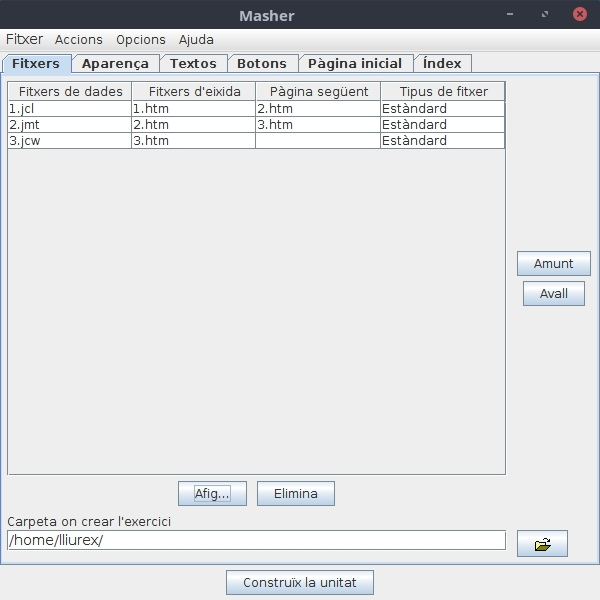 Per a unir totes les activitats en una única activitat hem de guardar tots els fitxers que hem creat en les activitats anteriors en una única carpeta. Després iniciem The Masher i afegim tots els fitxers. A continuació, només queda fer clic al botó de construir una unitat.