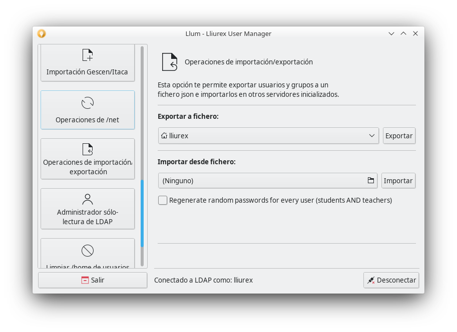 Si queremos importar los nombres de usuario accedemos al llum en la máquina donde queremos hacer la importación y vamos a Operaciones de Exportación/Importación. Buscamos el archivo que queremos importar y le damos a importar.