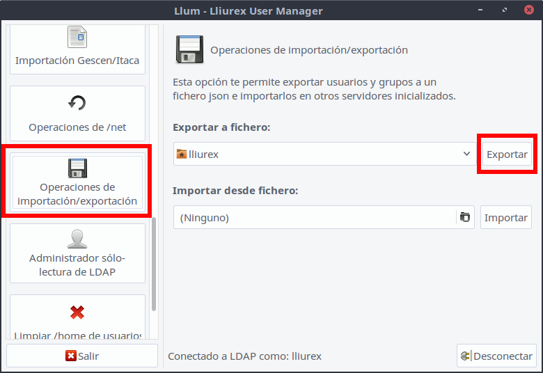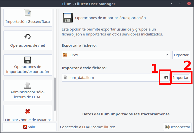 Si queremos importar los nombres de usuario accedemos al llum en la máquina donde queremos hacer la importación y vamos a Operaciones de Exportación/Importación. Buscamos el archivo que queremos importar y le damos a importar.