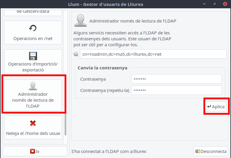 Per a inicialitzar l'usuari roadmin hem de fer-ho des del llum. Anem a l'apartat d'Administrador només de lectura de LDAP, posem la contrasenya i li donem a Aplicar. (Si l'usuari no s'inicialitza correctament podem solucionar-ho ací).