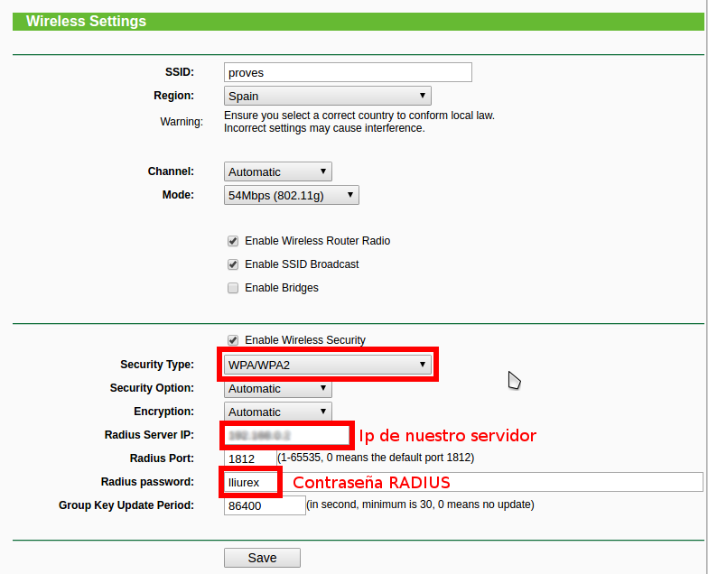 En el siguiente ejemplo tenemos la interfaz de configuración de un router Tp-Link (ten en cuenta que el sistema puede variar en función de la marca y el entorno de configuración que utilice tu router). El Radius Server IP es la Ip de la red interna de nuestro servidor, por defecto en LliureX 10.2.1.254.