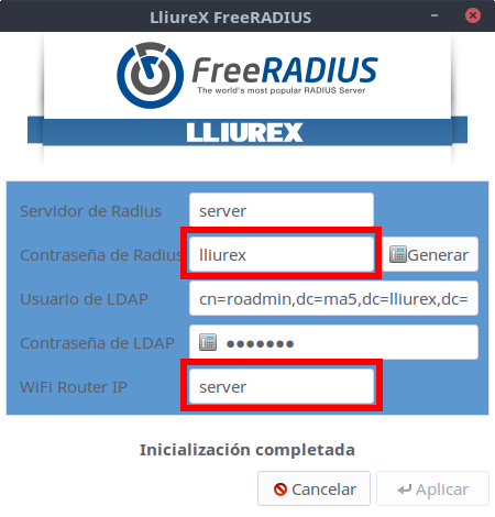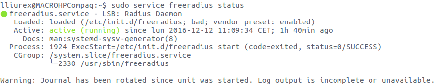 Una vez le damos a aplicar nos aparecerá Inicialización completada. En este momento ya tendremos FreeRADIUS funcionando e inicializado en nuestro servidor. No está de más asegurarnos de que el servicio está funcionando ejecuntando en el terminal: