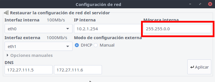 Hemos de fijarnos que conectamos los puntos de acceso al router/switch de la red interna de nuestro servidor. Recordemos que la ip de nuestro servidor es, por defecto, 10.2.1.254. Además hemos de tener en cuenta la cantidad de dispositicos que se van a conectar al servidor. Por defecto la máscara es 255.255.255.0 lo que permite conectar unos 250 dispositivos. Para evitarnos problemas, cuando inicialicemos el servidor podemos poner la máscara 255.255.0.0, así podremos conectar más de 65000. Si ya tenemos el servidor inicializado podemos cambiar la configuración de red: