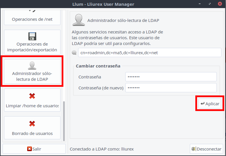 Para inicializar el usuario roadmin debemos hacerlo desde el llum. Y vamos al apartado de Administrador de sólo lectura de LDAP, ponemos la contraseña y le damos a aplicar. (Si el usuario no se inicializa bien podemos solucionarlo aquí).