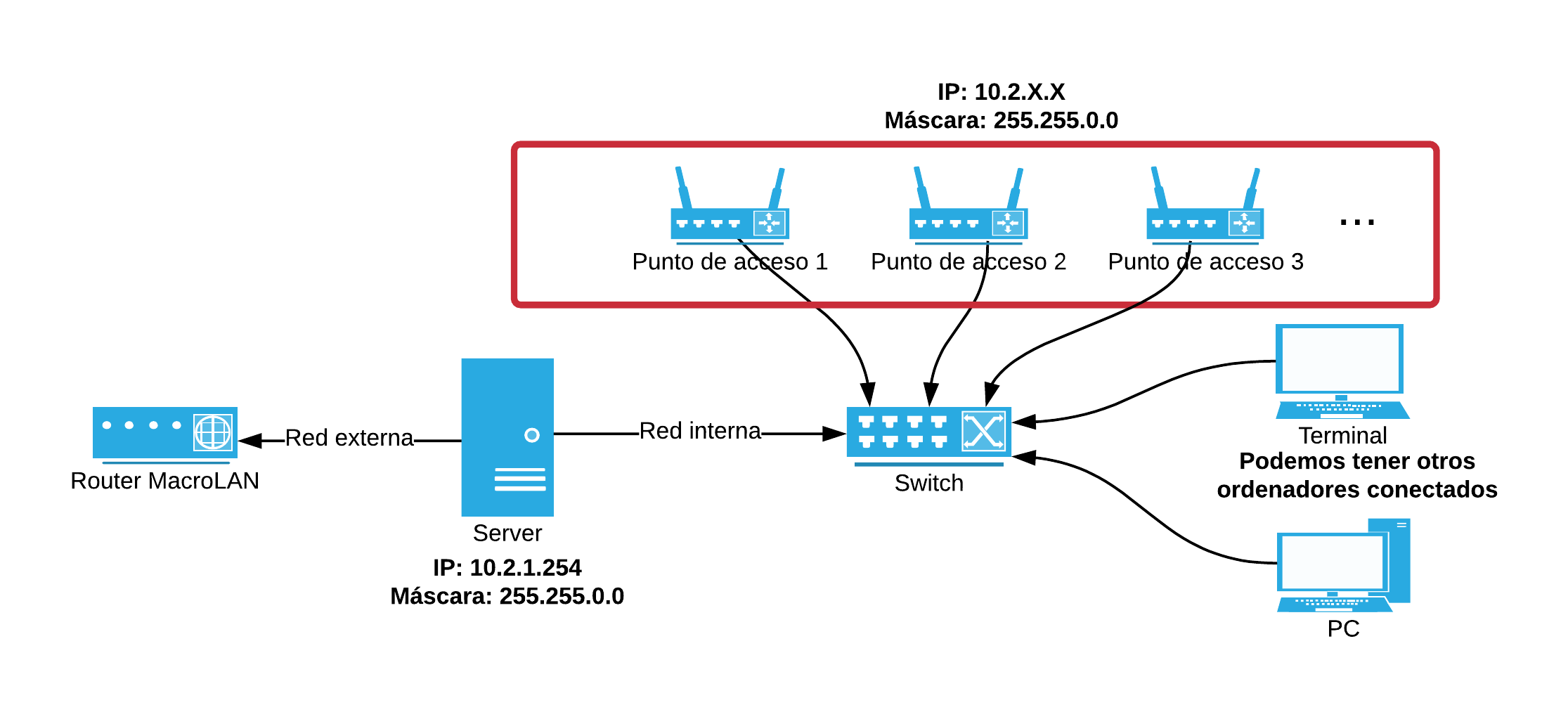 Ten en cuenta que si configuramos un servidor de aula en lugar de un servidor maestro, el servidor no irá conectado al modem MacroLAN sino que irá conectado al servidor maestro. En lugar de un Router para los puntos de acceso, podemos tener un switch al cual no le damos ninguna dirección Ip, ya que lo más habitual es tener el servidor trabajando como router.