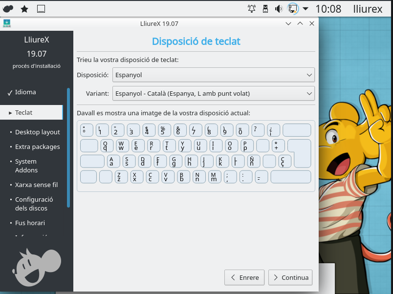 A continuació seleccionarem la distribució de teclat. L'opció que ve per defecte sol ser la correcta: