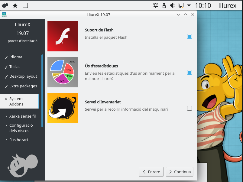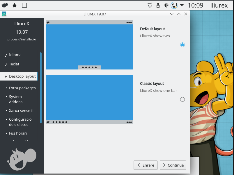El següent serà triar la distribució de l'Escriptori entre les 2 opcions disponibles: Estàndard o Clàssica: