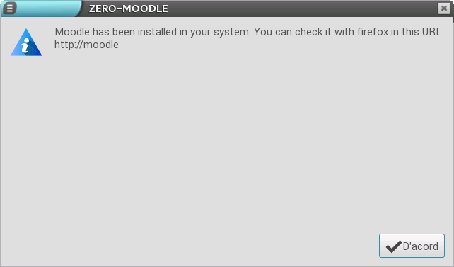 Després d'introduir-la, polsem el botó D'acord i continua el procés fins que acaba completament. En finalitzar mostra un diàleg que indica que s'ha instal·lat correctament, així com l'adreça web a través de la qual hi podem accedir.