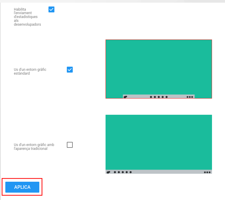 | Habilita l'enviament d'estadístiques a l'equip de desenvolupament | És important habilitar aquesta opció per a conéixer millor quines són les aplicacions més utilitzades . Les estadístiques són totes anònimes. |