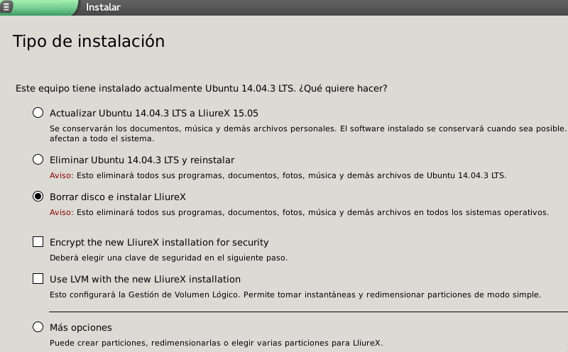 Actualizar XXXXXXX a LliureX 16.04: esta opción nos intentará actualizar la versión que tengamos instalada en el equipo, lo cual no se recomienda ya que dependiendo de la versión desde la que se actualiza y de los cambios que se hayan realizado en la misma nos puede fallar la actualización y por tanto no funcionar de forma correcta.
