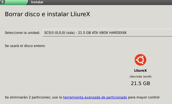En la siguiente pantalla se nos pide confirmación para proceder al borrado del disco y nos informa sobre qué disco duro se va a instalar.