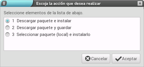 • Seleccionar paquete (local) e instalarlo: esta permite elegir un paquete (previamente descargado con, por ejemplo, la segunda opción) e instalarlo.
