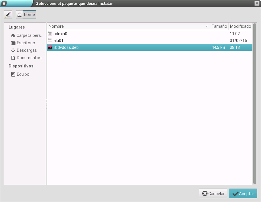 Tras seleccionar la opción y pulsar el botón Aceptar, nos muestra una ventana donde tenemos que seleccionar el paquete que queremos instalar.