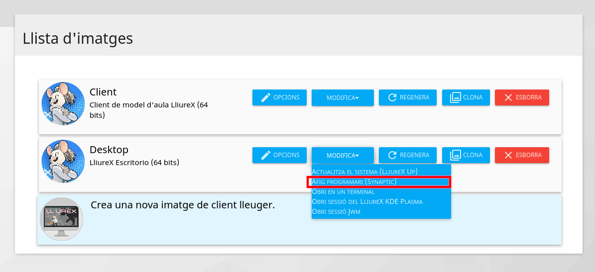 Una vez instalado, inicializado un servidor y tengamos una imagen ya creada tenemos la posibilidad de instalar nuevos programas para personalizar la imagen en función de la asignatura o del aula donde se vaya a utilizar. Para ello vamos a utilizar el Centro de administración de Lliurex 16, teniendo así la posibilidad de configurarlo desde cualquier ordenador conectado al servidor.