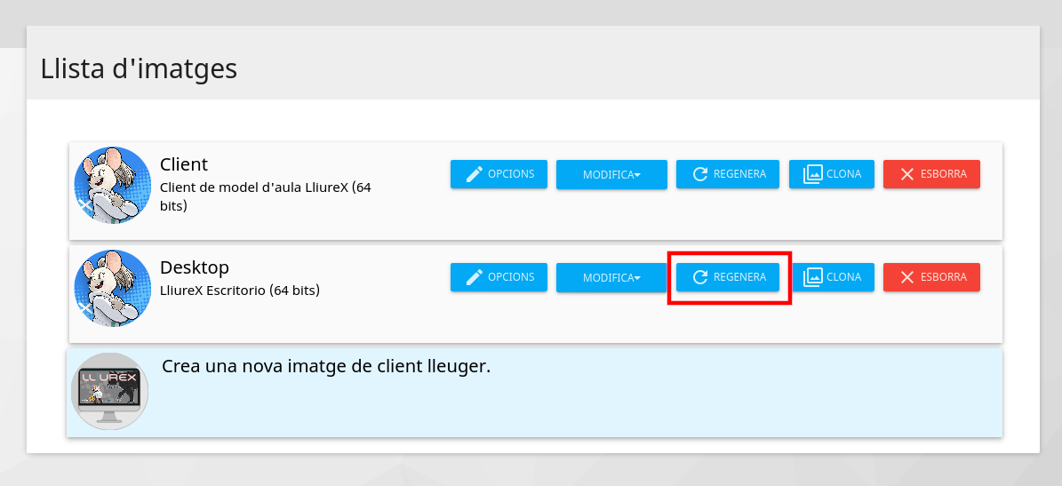 En la pantalla nos aparecerán todas las imágenes que tenemos creadas, deberemos pulsar sobre el botón MODIFICA y nos saldrá un menú donde pulsaremos Actualizar el Sistema.