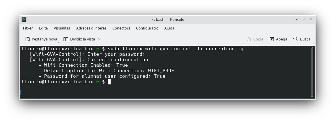 Per a usar aquesta versió, simplement s'obrirà una terminal i s'executarà l'ordre anterior amb l'opció desitjada. Les opcions disponibles es poden visualitzar escrivint lliurex-wifi-gva-control-cli -h