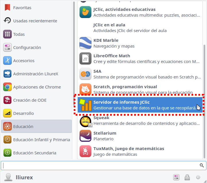 Per a iniciar Jclic report server, anem a Inici > Educació > Servidor d'informes de Jclic i l'iniciem: