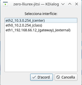 En el caso "external" o "gateway", generalmente representa que se desea prestar servicio hacia el "exterior", es decir, internet o bien hacia otros equipos que estén mas allá de la red de centro que este servidor provee. No obstante, dicha selección al estar fuera del ambito de control del servidor puede carecer de servicios necesarios para un funcionamiento sencillo por parte de los clientes, en dicho modo, no será posible configurar una resolución de nombre "jitsi.lliurex" para los clientes y debe proporcionarse por otros medios al cliente, o bien, utilizar una dirección ip directamente hacia el servidor por protocolo https y en el puerto 82. Ejemplo: https://192.168.66.12:82/nombre_de_la_sala.