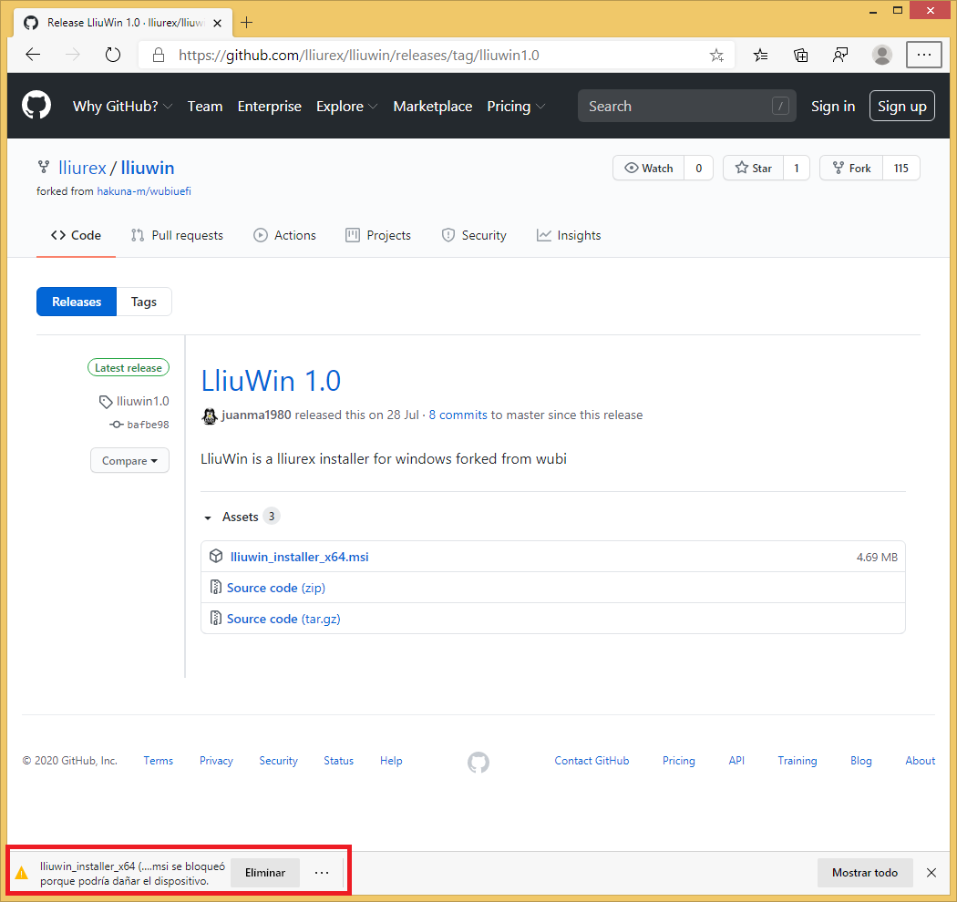 Al ser un repositorio de código la política de seguridad de Windows tratará de impedir que el usuario descargue y ejecute el fichero por su seguridad