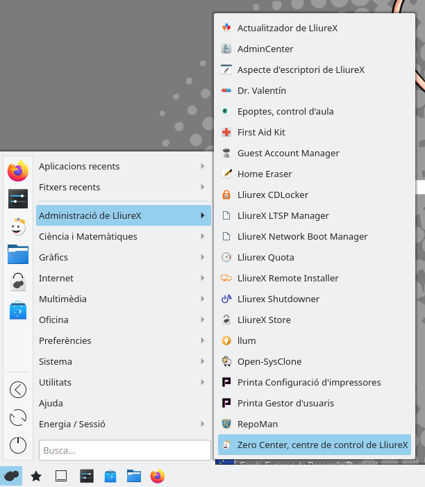 Per a accedir a la interfície gràfica, hem d'accedir al Centre de control de LliureX. Per a això, ens dirigim al menú: Aplicacions -> Administració LliureX -> Zero Center, Centre de control de LliureX.
