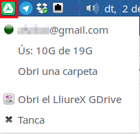 En la barra de notificacions ens apareixerà una icona de LliureX GDrive. Si polsem sobre ell ens apareixerà un menú on podrem veure l'estat del nostre compte. Tenim les següents opcions: