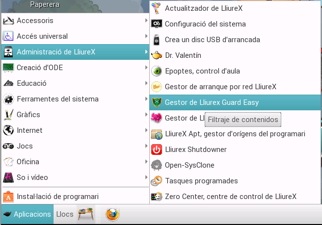 Podem accedir a l'aplicació a través del menú: Aplicacions -> Administració de LliureX -> Gestor de LliureX Guard Easy.