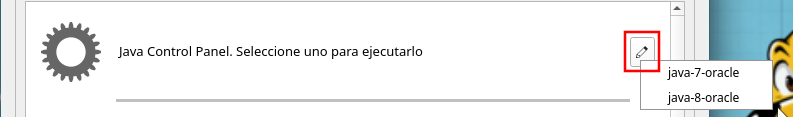 Es mostrarà una subfinestra amb les opcions de configuració disponibles en aquest moment, les quals depenen de les versions de Java que hi haja instal·lades. Cada opció (excepte la del Java Control Panel) mostra la versió configurada actualment i un botó que permet canviar de versió.