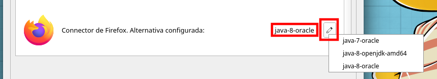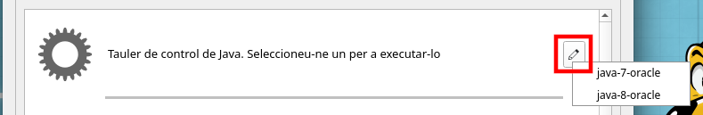 Es mostrarà una subfinestra amb les opcions de configuració disponibles en aquest moment, les quals depenen de les versions de Java que hi haja instal·lades. Cada opció (excepte la del Java Control Panel) mostra la versió configurada actualment i un botó que permet canviar de versió.
