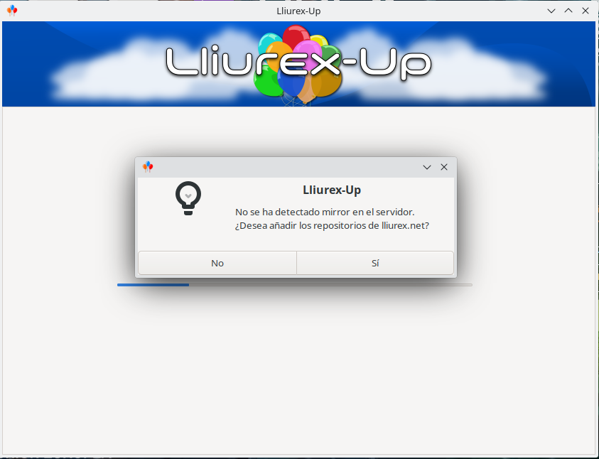 Si se intenta actualizar un cliente se comprueba si en el servidor correspondiente existe un mirror de Lliurex. De no existir se pregunta al usuario si quiere incluir los repositorios de lliurex en el fichero de sources-list.