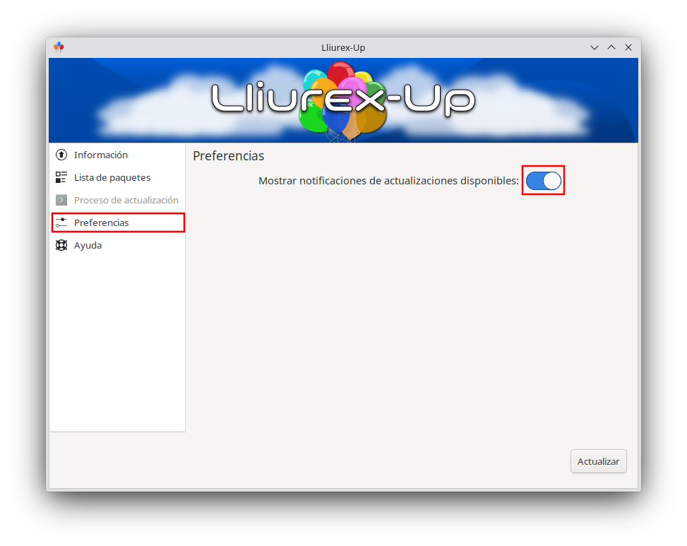 La desactivación del aviso de nuevas actualizaciones puede realizarse desde el panel Preferencias de Lliurex-Up (opción no disponible para los clientes)
