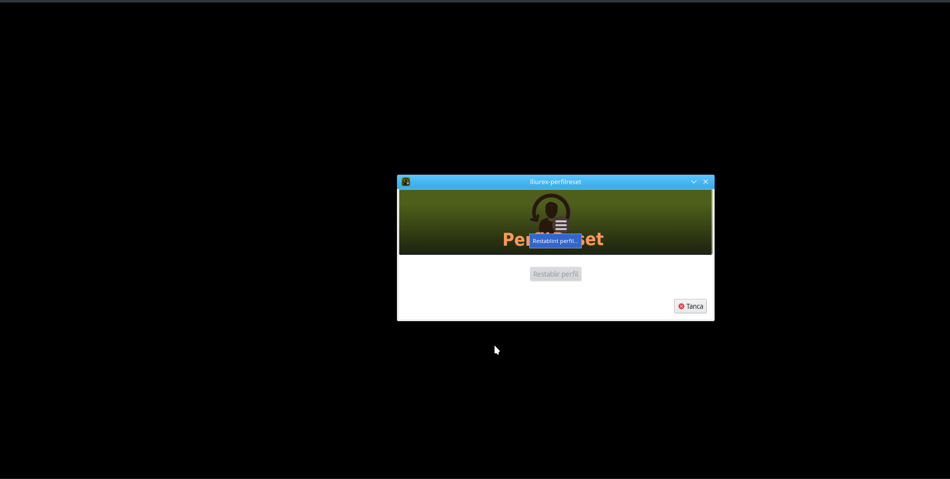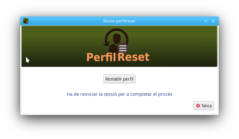 Per a revertir de forma ràpida i senzilla tots els canvis realitzats en la configuració de l'Escriptori i tornar a disposar de la configuració per defecte es disposa de l'eina LliureX-PerfilReset.
