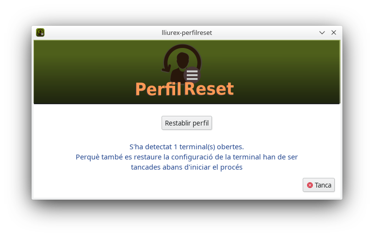 Si es detecten terminals oberts es mostra un missatge informatiu que indica que perquè es restaure també la configuració del terminal cal tancar tots els terminals oberts.