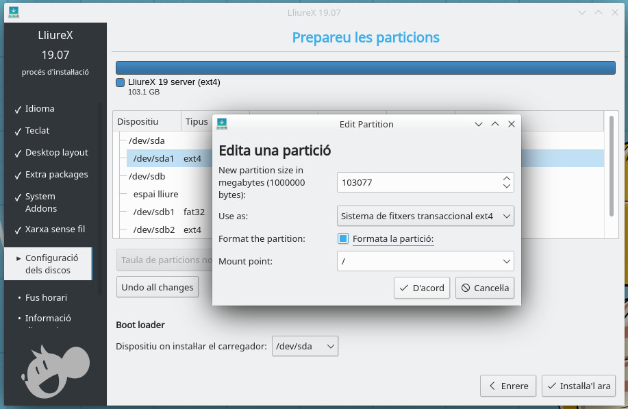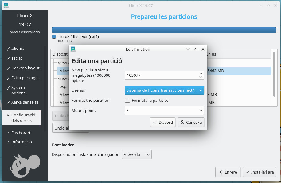 Per a continuar la instal·lació, hem de triar el punt d'instal·lació /. Així que triem la partició on volem que es faça la instal·lació i en Punt de muntatge, posem / i ací sí que és recomanable formatar la partició, ja que si no es formata, els arxius residuals poden causar situacions impredictibles en la nova instal·lació.