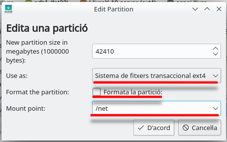 Ens apareixerà una finestra on posarem a Utilitza com a la mateixa mena de fitxers que tenim en aquest disc dur. I en Punt de muntatge posem /net. És important tindre en compte no fer clic sobre el selector de Formata la partició.