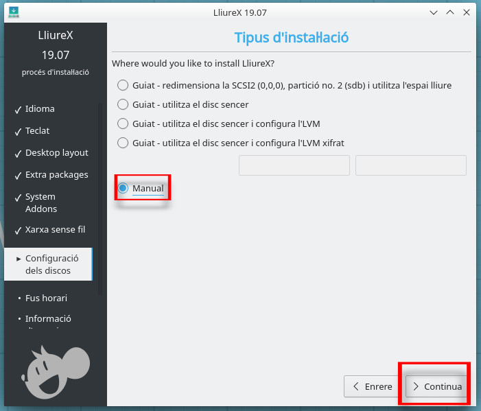 Per a això, en lloc d'eliminar LliureX i reinstal·lar, anirem a Manual en l'Ubiquity.