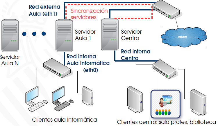 • Un servidor mestre: sol donar servei al centre (aules de docència, sala del professorat, etc.).