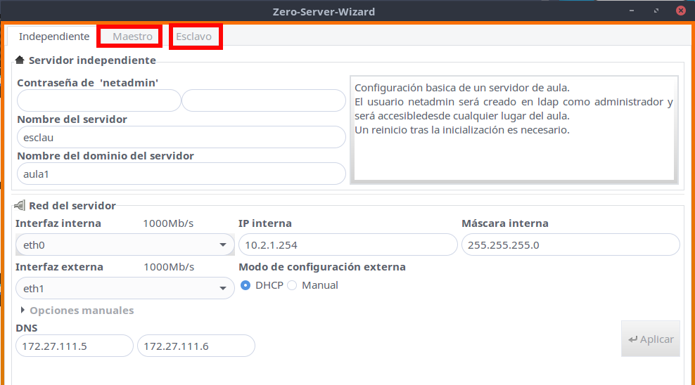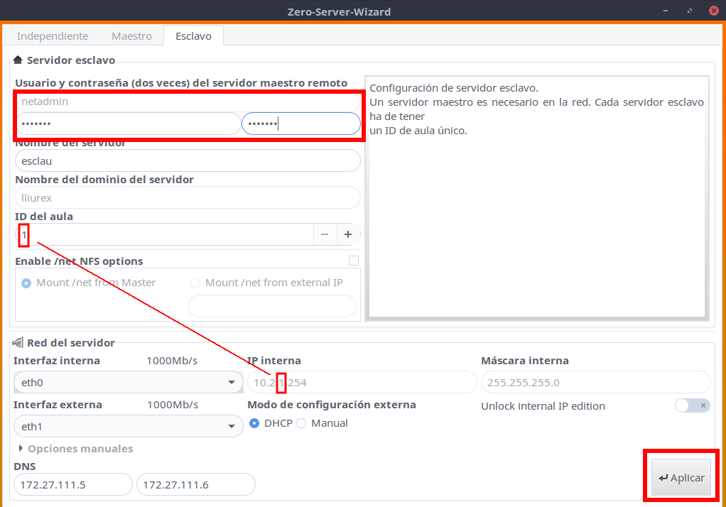 Para iniciar el servidor esclavo, nos vamos al servidor esclavo e iniciampos el zero-server-wizard, pero esta vez vamos a la pestaña donde pone Esclavo. En este caso debemos de proporcionar la contraseña de netadmin del servidor maestro darle un número al servidor. Ten en cuenta que no puede haber dos aulas con la misma id, ya que éstas van asociadas a la ip, por lo que deberemos de tener claro que identificadores vamos a dar a cada servidor esclavo. Le damos a Aplicar.