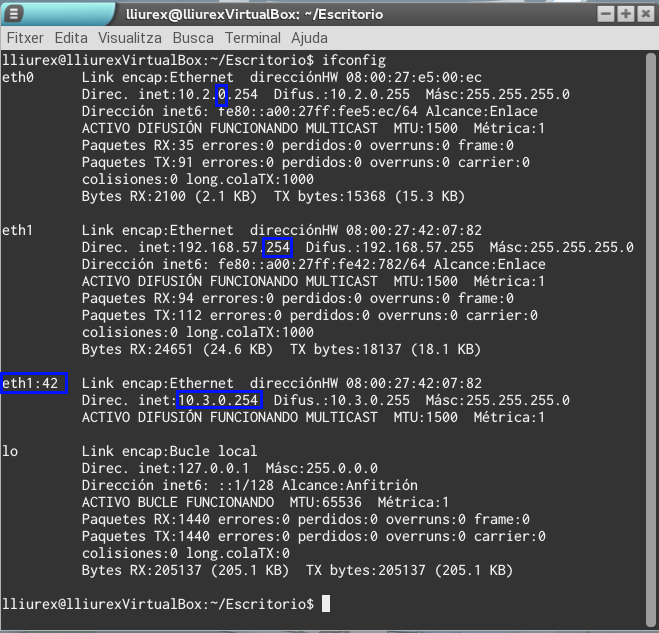 Quan s'obri, executem l'ordre ifconfig. En les dades que aparcen hem de comprovar si l'adreça de la interfície eth0 conté la direcció IP amb un 0 com a tercer dígit, l'eth1 conté una adreça IP acabada en 254, i l'eth1:42 conté l'adreça IP 10.3.0.254.