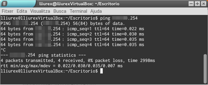 També hem de provar que les IP de sincronització són accessibles. Per a això hem d'executar, en el terminal, l'orde ping seguida de la direcció IP de sincronització.