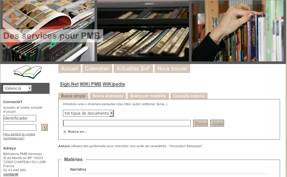 • La part esquerra, que permet canviar l'idioma així com identificar-se (amb l'usuari creat en el PMB). També conté dades de la biblioteca o del centre de documentació.