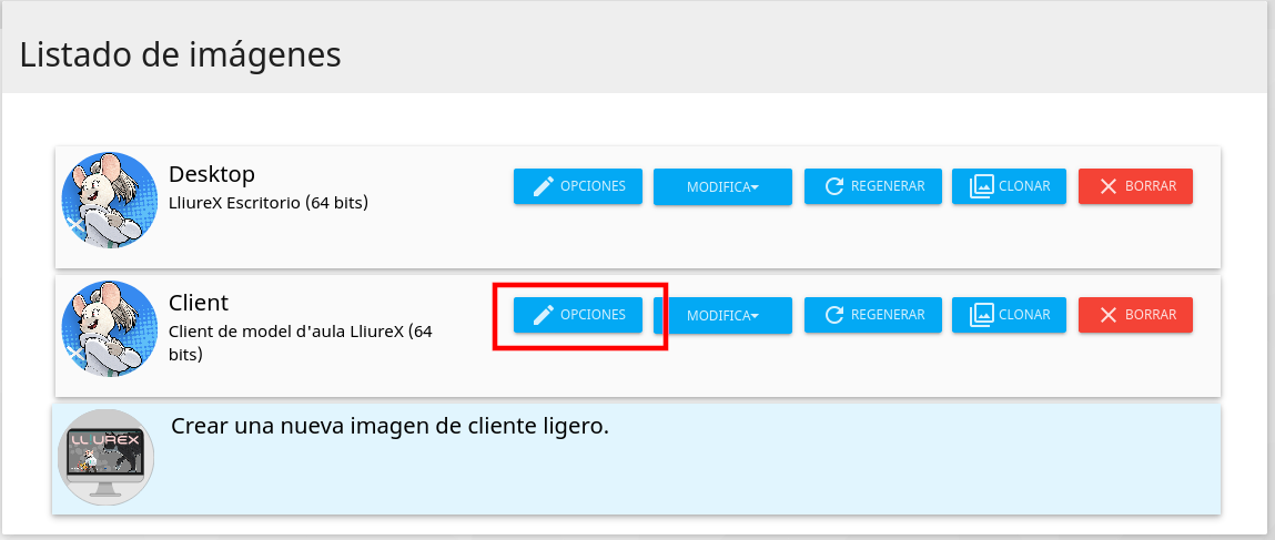 Las opciones de la imagen nos permiten configurar algunos parámetros de la imagen, pero muchas veces tendremos que recurrir a parámetros generales o parámetros del cliente. Esta opción tiene más prioridad que las opciones generales pero menos las opciones de cliente. Para acceder a ella vamos a Gestión de imágenes de cliente dentro del menú LliureX LTSP: